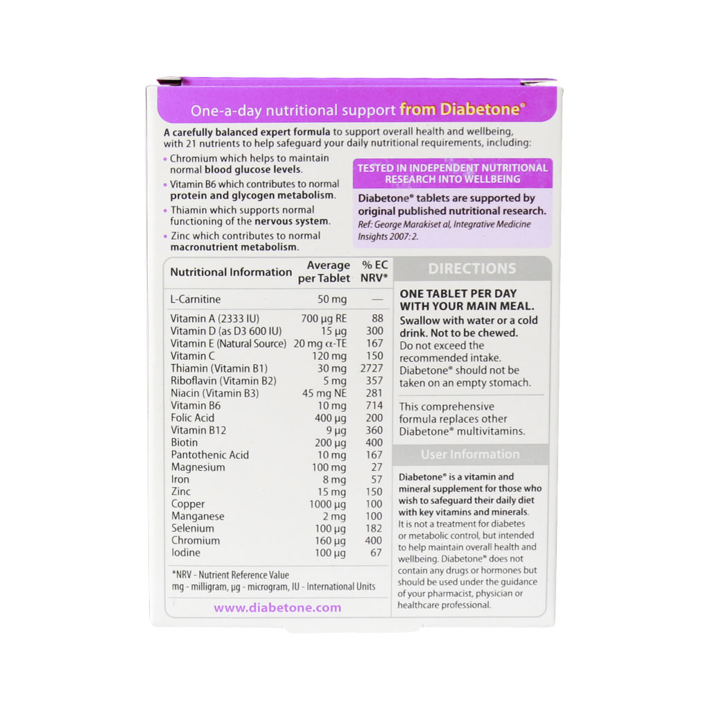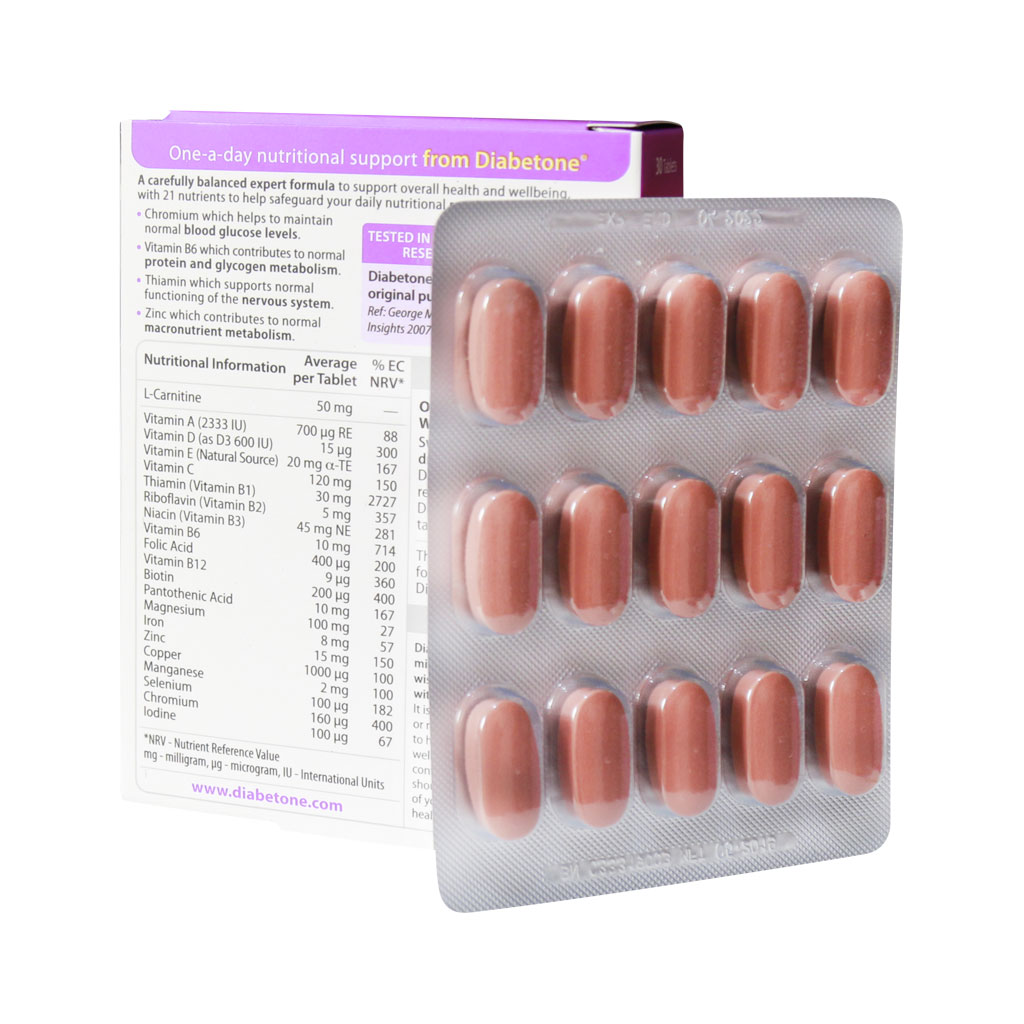 - قرص Diabetone فاقد گلوتن، فاقد لاکتوز، بدون شکر افزوده، فاقد نمک، فاقد مخمر، بدون رنگ مصنوعی و مواد نگهدارنده است.