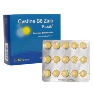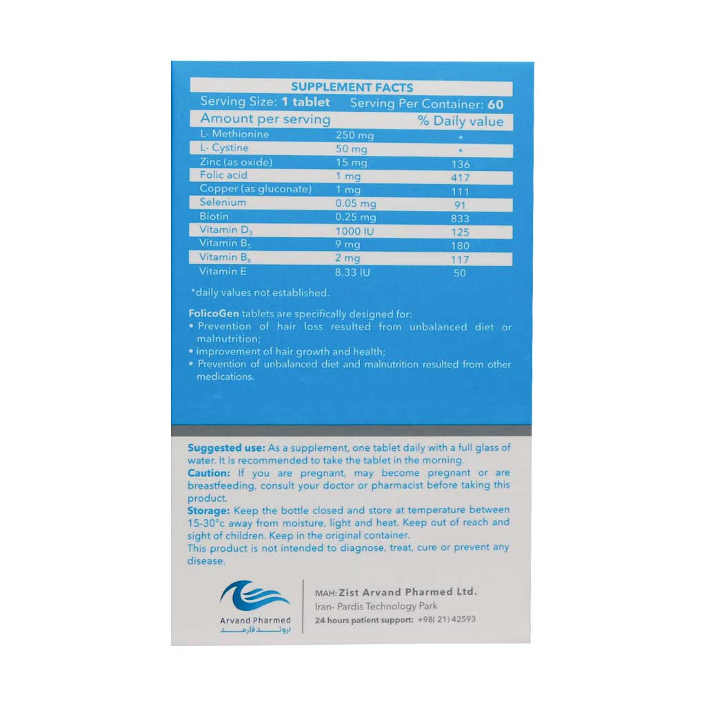 عنوان مقدار نیاز روزانه L-Methionine250 mgL-Cystine50 mgZinc ( as Zinc Oxide )15 mg136 %Vitamin B9 ( Folic Acid )1 mg417 %Copper ( as gluconate )1 mg111 %Selenium0.05 mg91 %Vitamin B7 ( Biotin )0.25 mg833 %Vitamin D3 ( Cholecalciferol )1000 IU125 %Vitamin B5 ( Panthotenic Acid )9 mg180 %Vitamin B6 ( Pyridoxine )2 mg117 %Vitamin E8.33 IU50 %قرص فولیکوژن باعث تحریک و بهبود عملکرد سلولی فولیکول های مو می شود و با تامین ویتامین ها و مواد معدنی کلیدی به فرآیند های پایه متابولیسم کمک می کند.