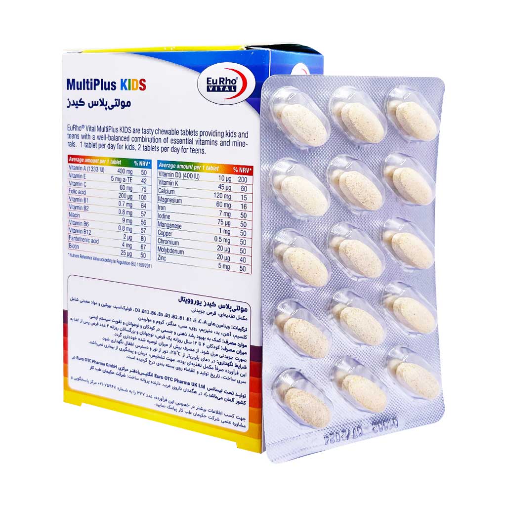 قرص مولتی پلاس کیدز یورو ویتال، قرص های جویدنی خوش طعم هستند که تامین کننده میزان مناسبی از ویتامین های ضروری و مواد معدنی می باشند. میزان مصرف این فرآورده یک عدد قرص برای کودکان و دو عدد قرص برای نوجوانان می‌باشد.