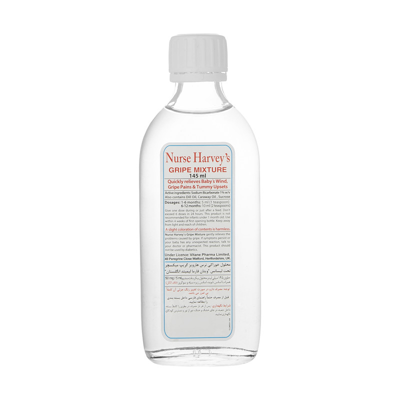 عنوان مقدار نیاز روزانه Sodium Bicarbonate (50 mg/5ml)145 mlDill Oil (شويد)Caraway Oil (زيره سياه)Sucroseاین محصول تحت لیسانس شرکت Vitane Pharma Limited انگلستان، در شرکت داروسازی امین تولید شده و شرکت دارو درمان سپهر دارنده پروانه ساخت آن می باشد.