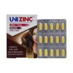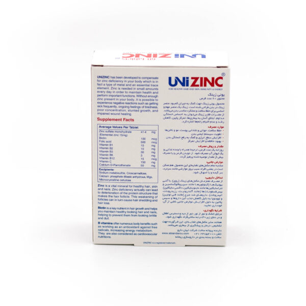 فرمولاسیون Uni zinc شامل ترکیبی از روی (زینک)، ویتامین های گروه B و ویتامین C می باشد. قرص Uni Zinc موجب حفظ سلامت پوست، مو، ناخن ها و تقویت سیستم ایمنی بدن می گردد.